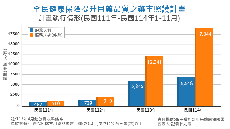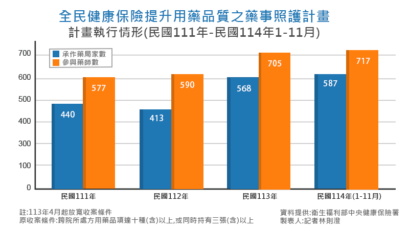 張禹斌副署長說,民國112、113年藥事照護計畫,醫師對藥師建議回應率約75%,個案用藥依從性維持在90%左右或以上,收案對象使用藥品品項增減率兩年皆下降約7%。另截至114年11月底,共有587家藥局、717名藥師參與,服務人數6648人、服務人次1萬7344件,影響力逐年擴大,但參與藥局數相較全台灣的健保特約藥局數,有成長空間,後續健保署及相關部門也將持續與藥界溝通,鼓勵更多藥局加入。
