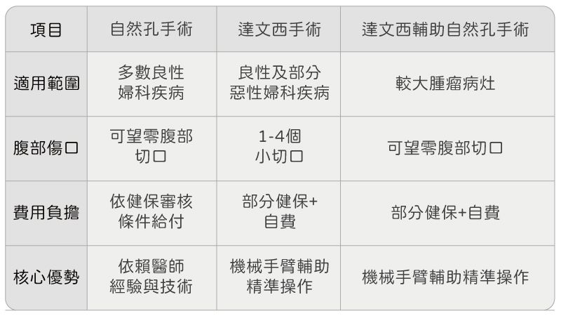 李易良醫師表示,沒有任何一種手術是適用於所有人的。例如,達文西手術在處理部分惡性腫瘤或複雜案例上具有優勢;而自然孔手術則常用於良性婦科疾病(如子宮肌瘤、卵巢囊腫、子宮腺肌症、良性子宮切除等),可作為微創治療的選項之一。