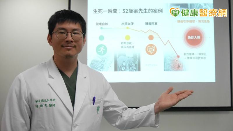 52歲梁先生平時身體狀況良好,去年中發現解便出現血便後,立即至診所就醫,糞便潛血檢查呈陽性,隨後安排大腸鏡檢查,發現大腸腫瘤已造成腸道阻塞。然而在等待病理切片結果期間,梁先生突發劇烈腹痛,緊急送醫後確認為腫瘤侵蝕腸壁導致腸穿孔,合併腹膜炎與敗血症。