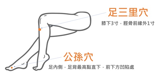 在穴位保健方面,腹部與四肢分布多個與消化相關的重要穴位,包括中脘穴(肚臍上4寸)、天樞穴(肚臍旁2寸)、足三里穴(膝下3寸)、內關穴(腕橫紋上2吋)、公孫穴(足內側)等,適度按摩可促進腸胃蠕動、減緩腹脹與噁心感。