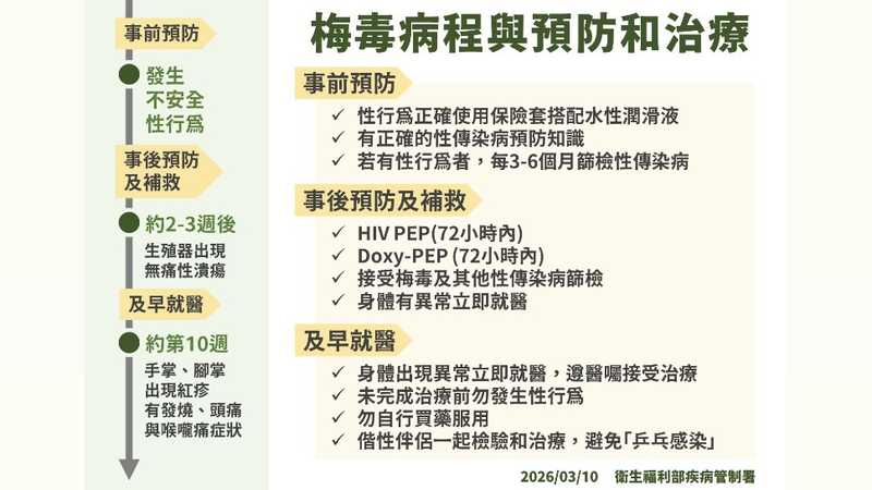 ▲梅毒病程與預防和治療。(圖/疾管署提供)