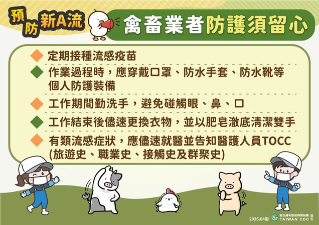 針對此次案例,疾管署提醒廣大禽畜養殖從業者,於作業過程中,必須嚴格落實個人防護措施,工作結束後,應進行徹底清消。若出現急性呼吸道感染或結膜炎等症狀,就醫時務必主動告知職業別與動物接觸史,以便醫療體系在第一時間進行精準診斷。